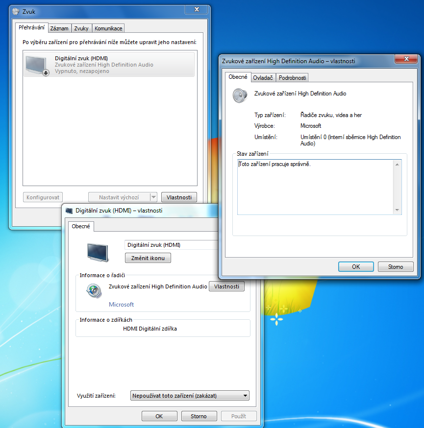 Ovládací panel/Zvuk jsem také řešil. Z toho pochází první obrázky. Pro přehlednost přikládám ještě jednou Zvuk/Přehrávání. Vše, co zde jde udělat, je zakázat nebo povolit to digitální zařízení. Nesouvisí to s tou počáteční příčinou, kdy počítač nebyl schopný detekovat síťovou kartu, CDROM ani USB? Zřejmě do toho patřil i zvuk, ale ten jsem tehdy neřešil.