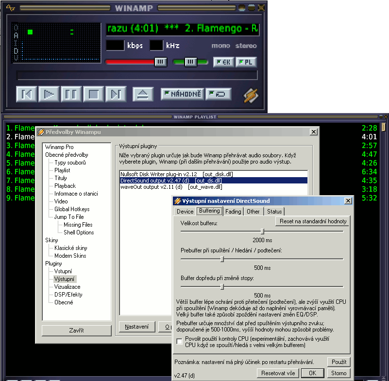 Jedině kdybych tam nastavil 0 sekund, pak by to snad mělo fungovat jako plynulý přechod, ale zkusil jsem si ověřit, jak je to s tím bufferingem; nespletl jsem se: když jsem nastavil první táhlo (velikost bufferu) na minimum (333 ms) a ostatní dvě táhla (Prebuffer při spuštění/hledání/podtečení a Buffer dopředu při změně stopy) na nulu, dělal Winamp mezi jednotlivými skladbami mezery (než načetl začátek další), zatímco při těch hodnotách, které mám na obrázku o kousek výš (2000, 500 500 ms) mi na sebe jednotlivé skladby navazují stejně, jako by navazovaly na vinylové desce (například album bez mezer Dark Side Of The Moon od Pink Floydů).