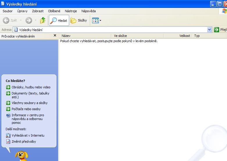 Prosím o radu - mám Win XP - když v nabídce start zvolím hledání - zobrazí se mi sice tabulka ale prázná jen s psíkem, ale už není kam písnouti, co že to chci vlastně hledat. Díky