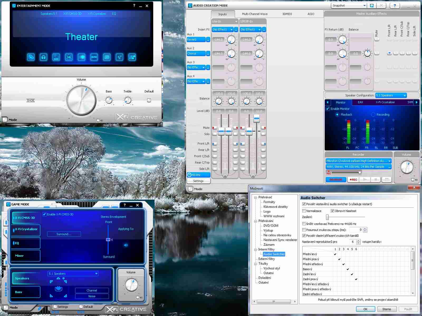 mám repráky Logitech X-530 (5.1) a koupil jsem si zvukovou kartu http://zvukove-karty.heureka.cz/creative-sound-blaster-x-fi-xtreme-audio-pci-express/ v domnění, že tato karta půjde nastavit tak, aby vytvořil u filmu, kde je pouze stereo zvuk zvuk prostorový. Nedaří se mi to ovšem nijak nastavit. Filmy co v sobě zvuk 5.1 mají fungují správně, ale ty, co jsou pouze stereo beží jenom na 2 repráky. Nevíte někdo jak to správně nastavit?....mělo by to jít...Díky