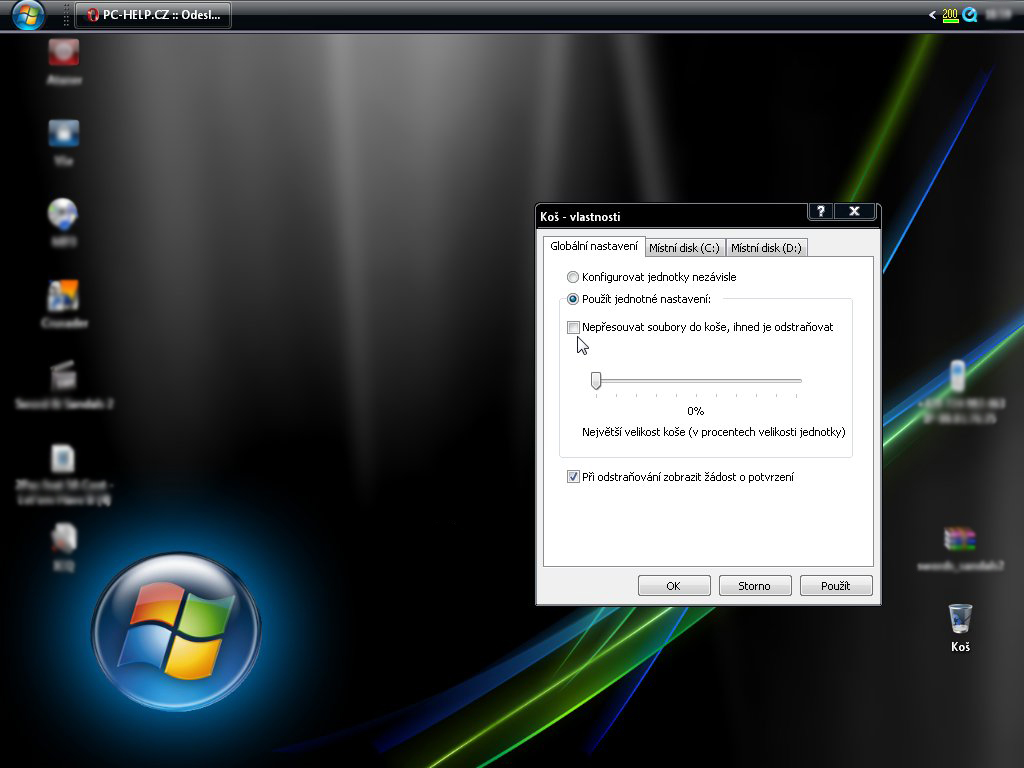 PS: ve vlastnostech koše nemám zaškrtnuté políčko - "Nepřesunovat soubory do koše, ihned je odstraňovat"