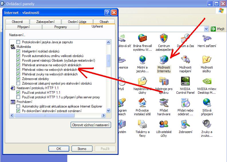 Ovladací panely - Možnosti internetu, tam musíš mít přehrávání videa povoleno - screen