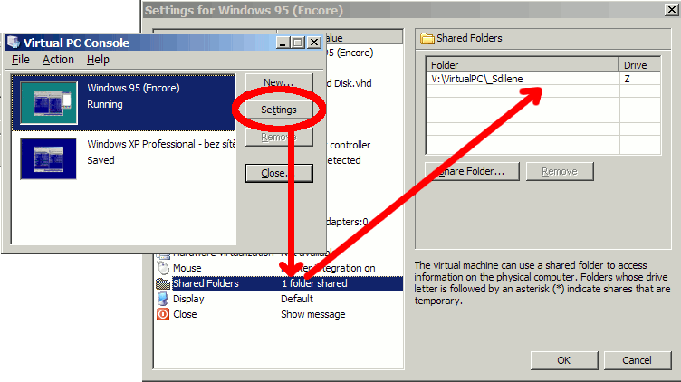 a pak při spuštěném virtuálním systému nastavíš z hostitelského sdílenou složku: