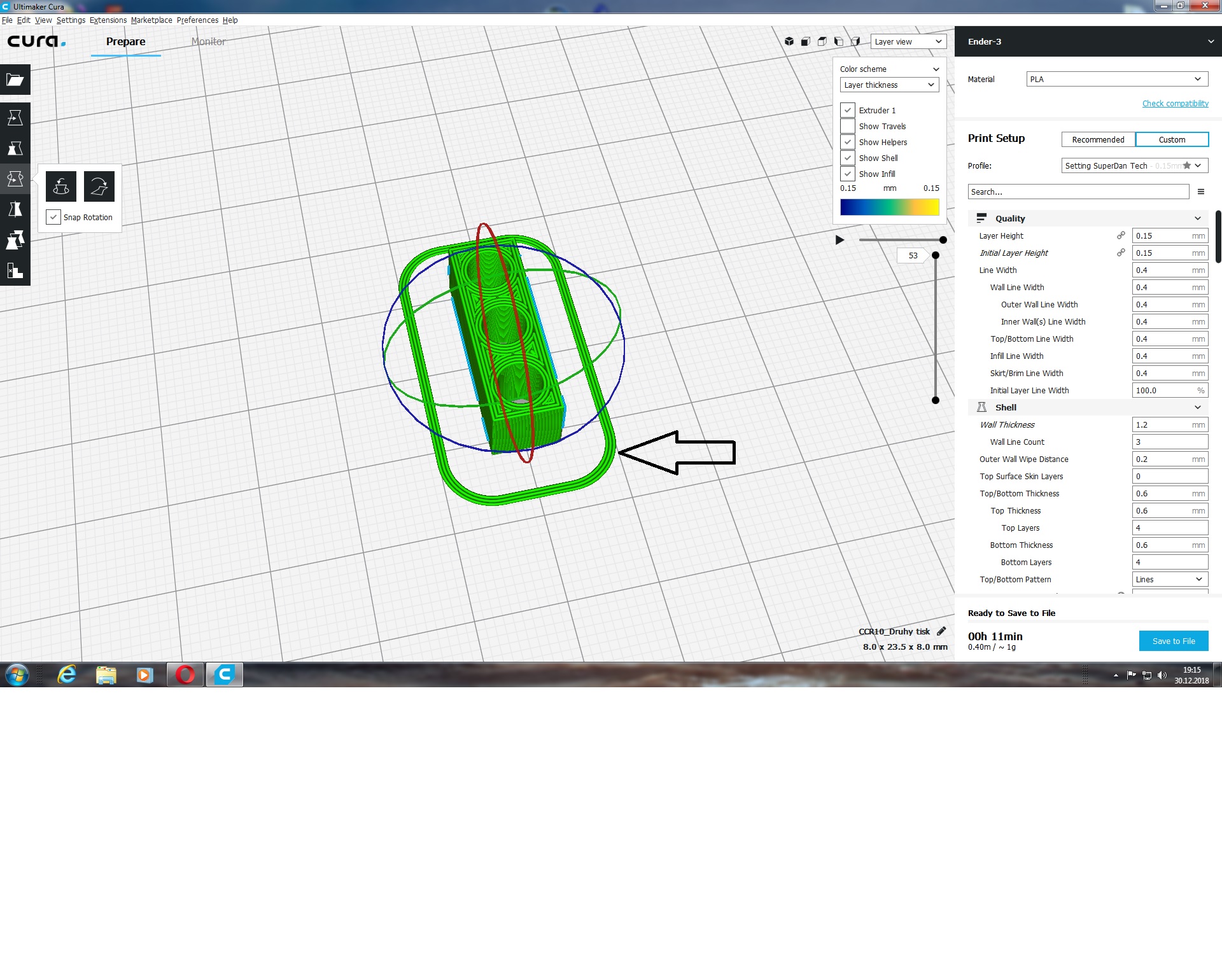 Je to dobré, díry jsou již krásně kulaté. Ještě bych měl otázku, čím se nastavuje funkce, kdy 3D tiskárna nejdřív "objede" model určený k tisknutí a teprve potom se již věnuje samotnému modelu?