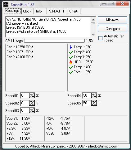 Teploty ze SpeedFunu jsou celkem OK.Jenom harddisk píše nesmysly.Ale je léto-mohl by se přehřívat.Zkus program HDD temperature.Ten ti ukáže tu správnou teplotu pevného disku.Každopádně by neměla překročit 50°C.S tím zdrojem je to těžší.Nejlepší by bylo vyzkoušet druhý.Ale na to je ještě čas-první vyloučíme přehřívání pevného disku.