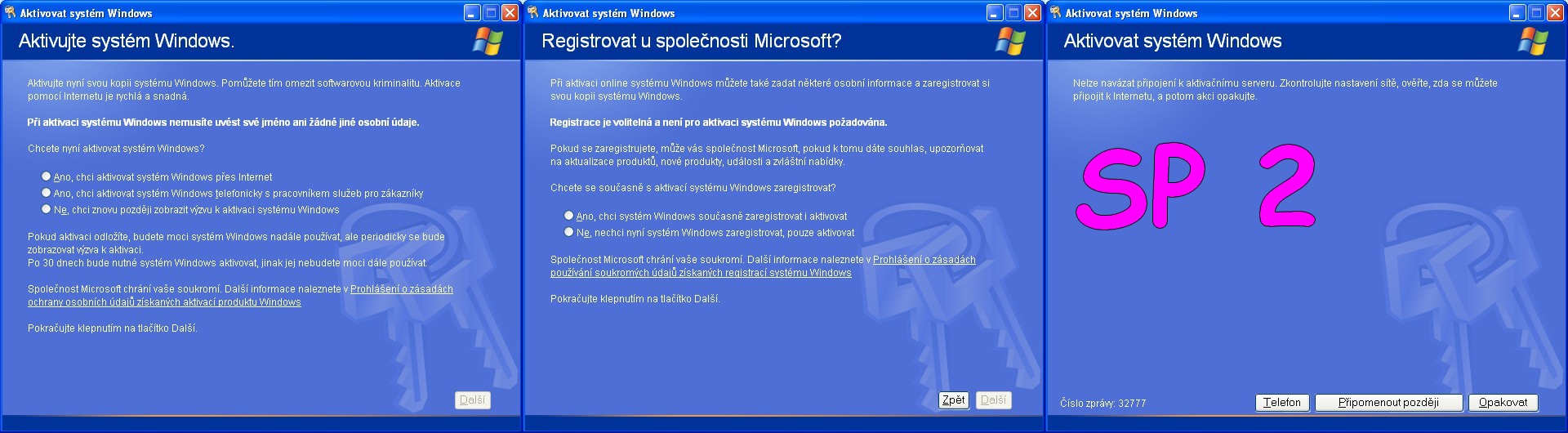 Aktivace XP HOME a PROFI jde. Po netu. Musí tam být balíček SP3, SP2 mi nejde. Telefonicky to už taky nejde, vyzkoušeno.