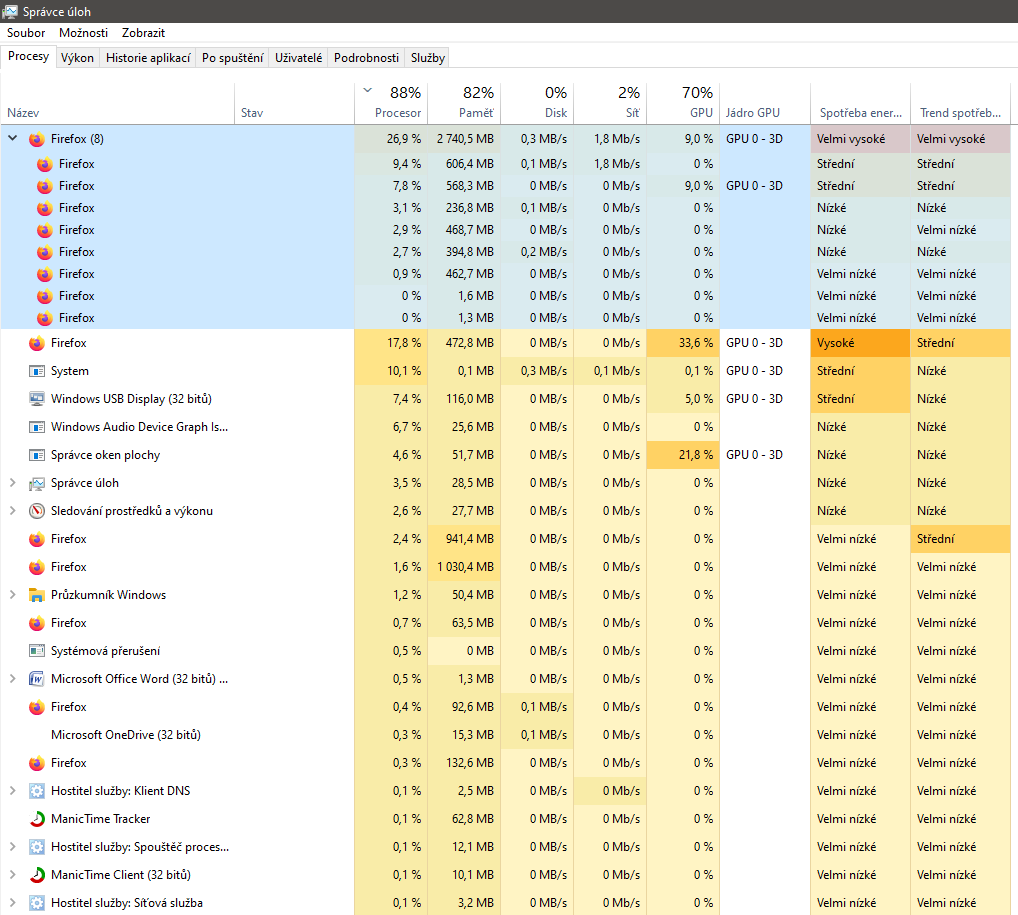 Problém je, že mám trvale využití CPU na 100 %, přičemž firefox trvale žere 50-60 % CPU. Mnohdy je Notebook fakt pomalý. Mám trvale otevřené tři okna firefoxu celktem tak možná 15 otevřených záložek. Nicméně si nemyslím, že by počet otevřených záložek měl mít vliv.