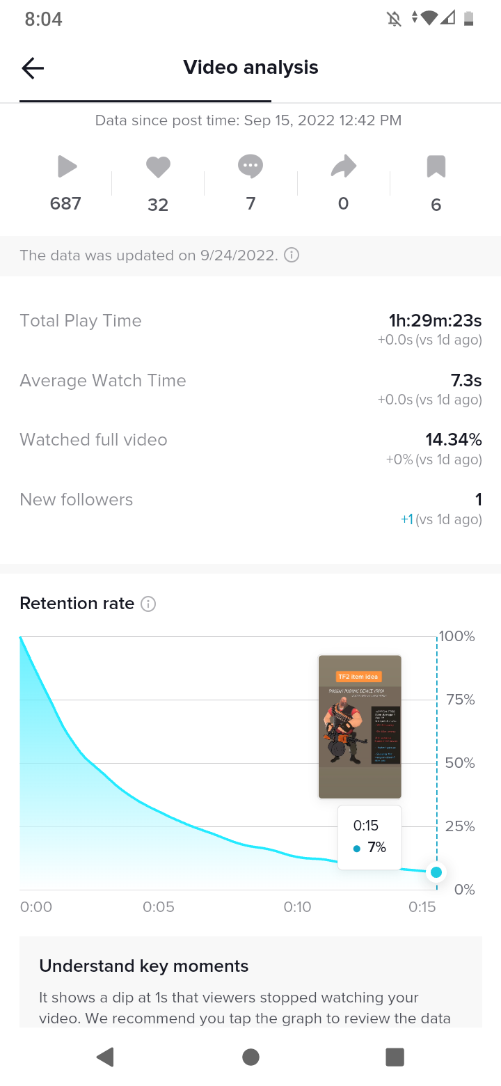 Video si spustilo tých 14% užívateľov, ktorí sledujú tvoj profil (príkl.: zo 100 len 14 ľudí). A postupne sa odpájali, ukončovali sledovanie (a asi tušíme , prečo - nedalo sa to pozerať, bola to videovolovina) a celých 15s si pozrelo len 7% (vytrvalci