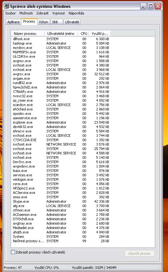Zdravím. Byli byste někdo tak hodnej a mrkli se mi na seznam spuštěných procesů ve správci úloh a napsali, co případně zmazat. Mám pocit, že toho je spuštěno zbytečně moc a zpomaluje mi to PC. Bohužej jsem ten seznam procesů neuměl zkopírovat jinak, než pomocí Prnint Screen jako obrázek. Dík za radu.