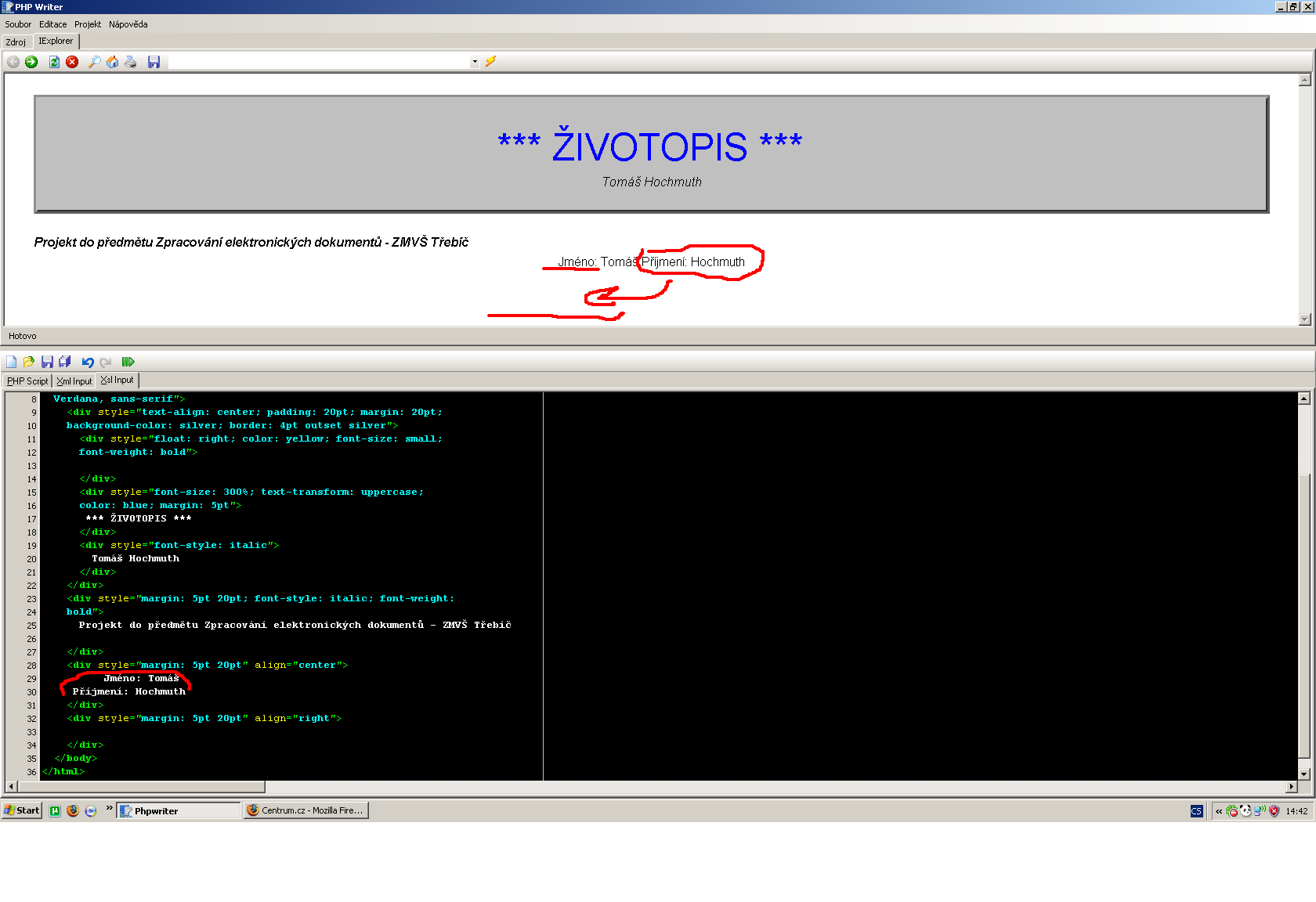 Tak jsem se tím nějak prokousal, ale potřebuji pomoct s tím, jak odsadit. Myslím tím, jak udělat, aby přijmení bylo na novém řádku. Na screenu to jde vidět: