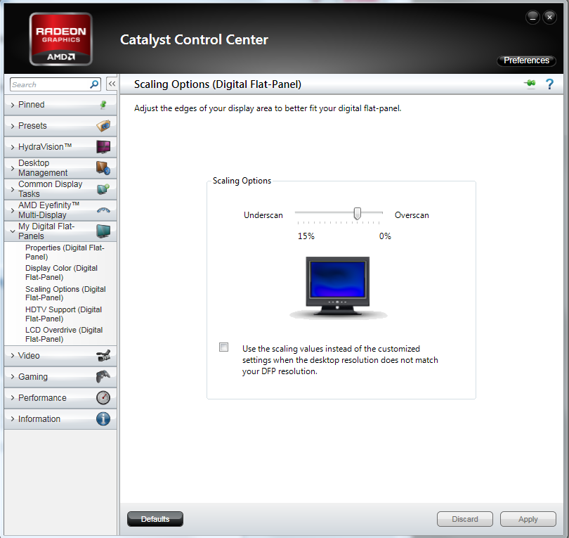 otevři catalysty tam najdi Scaling Options a tam pohybuj posuvníkem a ono se to upravá až budeš mít okraje spolu s okryjem displaye tak to nastavení ulož