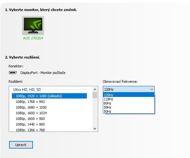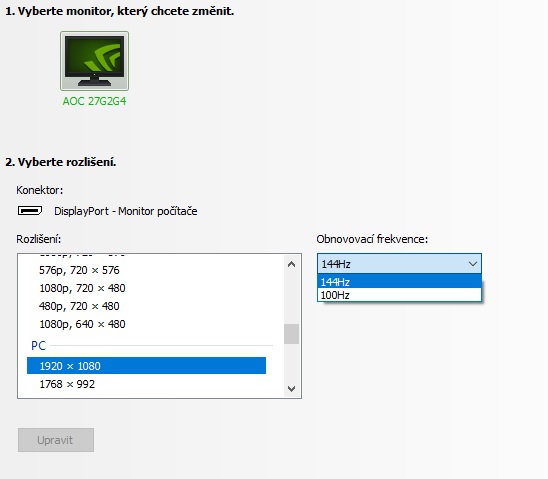(viz obrazek cislo 1). Kde sice je 1920x1080 s moznosti 144hz, ale z nejakyho duvodu to neni mezi HD profilama.