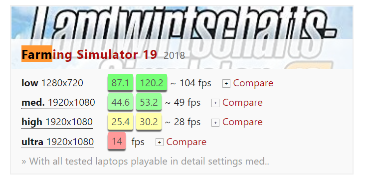Na youtube jsem našel pro farming simulator 19 video kde se to ojedinělo seklo pod 25 fps na sekundu až dvě.