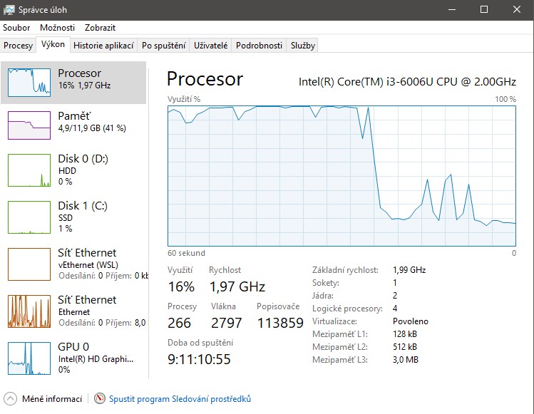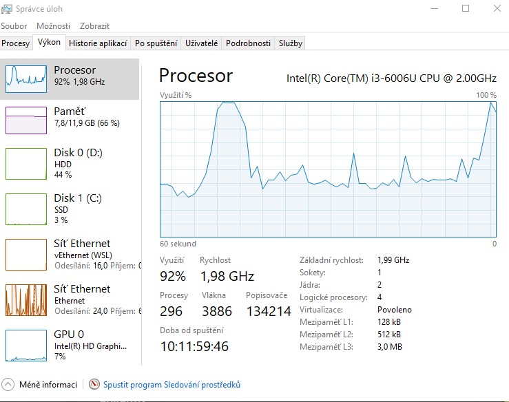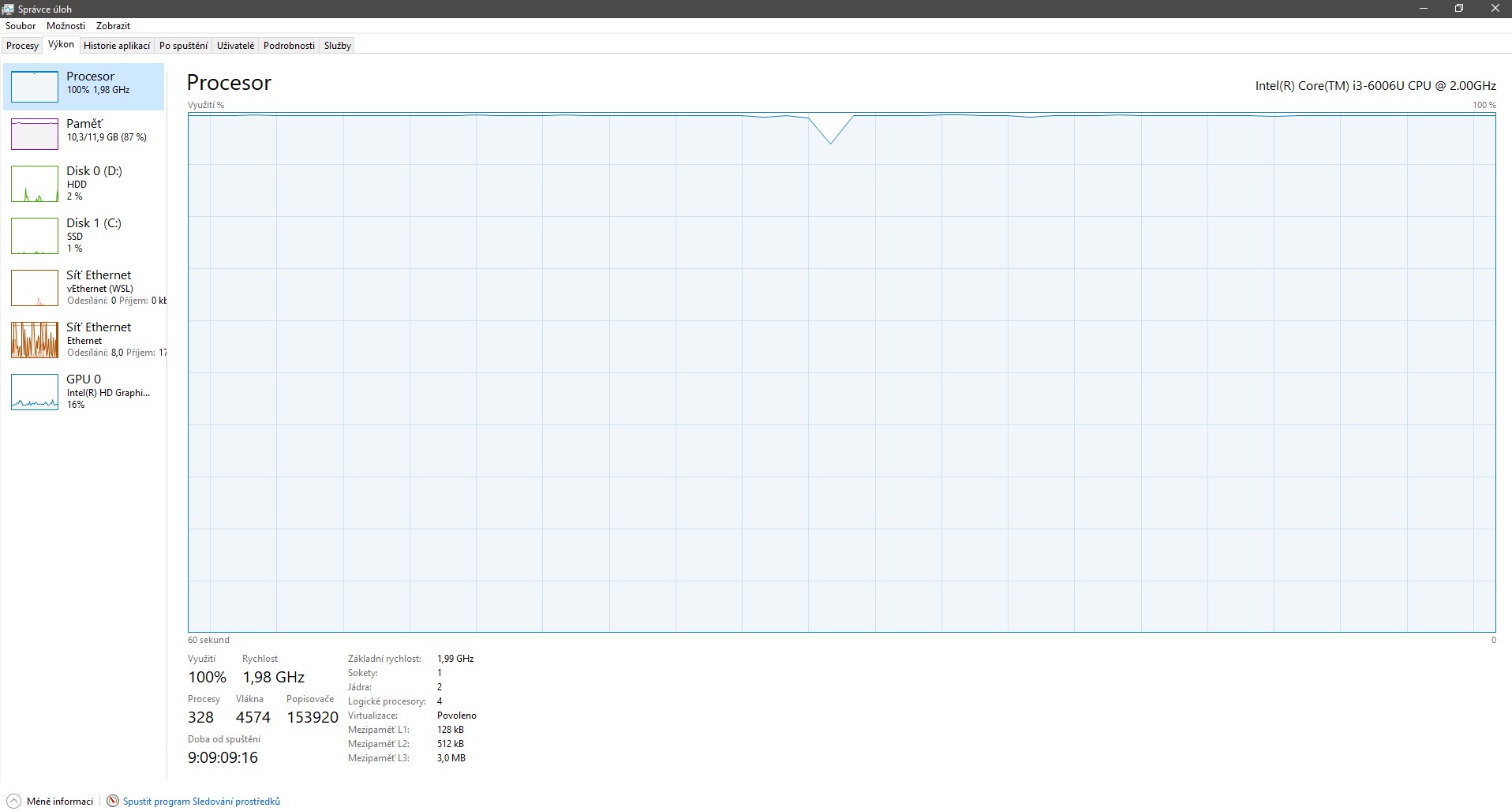 chápu správně, že můj notebookový Intel(R) Core(TM) i3-6006U CPU @ 2.00GHz 1.99 GHz nestíhá po většinu času jeden na 100%