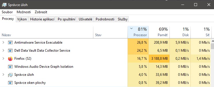 Kdyby běžel jen Firefox, tak jsem s využitím CPU spokojen. Průměr max 50 %, podle toho, kolik Windows nesmyslů jak využívá.