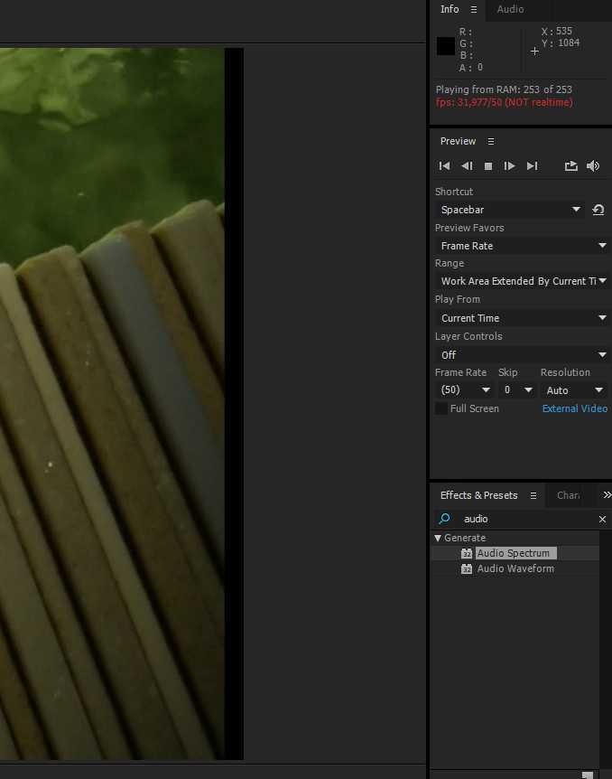 mám tuto sestavu Inter Core i5-4460, 3,20 GHZ,  RAM 8GB,  GeForce GTX960 a rád pracuji v After Effects (nemám to k práci) jen jako hobby, ale od určité doby nevím čím to může být, ale preview videa se načítá déle a hlavně i když se načte kompletně video a přehrává se tak nejde zvuk a napravo v rohu mi to stále píše, že preview neběží v reálném čase.