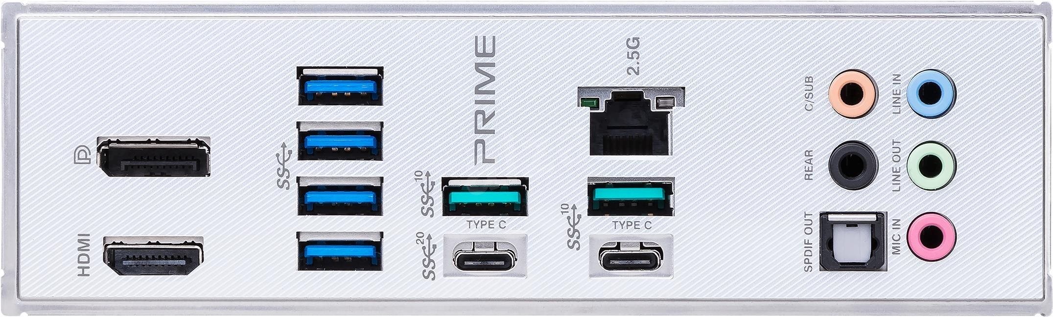 Přejděme k IO shieldu na něm můžeme nalézt 1x HDMI a 1x Display Port pro integrovanou grafiku (pokud ji v procesoru máte) dále 4x USB 3.2 generace 1 (typ A), 2x USB 3.2 generace 2 (typ A), 2x USB 3.2 (typ C) jenž jeden je obyčejný Gen 2(10Gb za sekundu) a druhý je 2x Gen s až dvojnásobnou přenosovou rychlostí. Pro připojení k síti je zde RJ45 konektor, který zvládá rychlosti 2,5 Gbps a to díky kontroléru Intel I225-V, která je vůči Realteku lepší variantou. Co se týče zvuku, o ten se na desce stará kontrolér Realtek S1220A, který dnes už není to nejlepší co se dá sehnat, jelikož Realtek již prodává ALC4082 do těch nejlepších a nejdražších základních desek. Realtek S1220A je postavený na kodeku ALC1220 a vylepšený o drobné úpravy výhradně pro Asus.