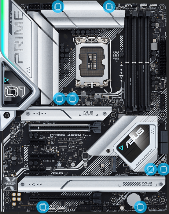 K napájení procesoru jsou na desce Asus Prime Z690-A dva ATX 12V 8 pin konektory, které nebudou mít žádný problém s napájením i extrémně přetaktované i9 12900KS. Totéž lze říci i o napájecích fázích, kterých 16 pro procesor a 1 fázi pro integrovanou grafickou kartu na procesoru. Všechny fáze mají regulátory napětí typu DrMos (60A), které integrují low side i high side mosfety do jednoho čipu.