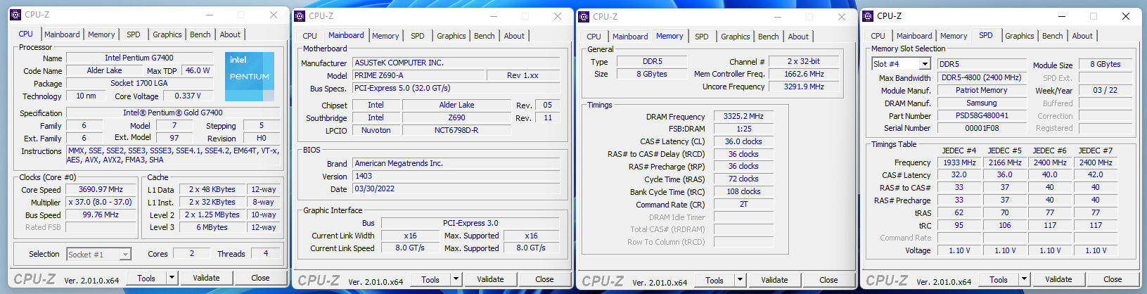 Základní desku Asus Prime Z690-A jsem testoval na Windows 11, jako procesor posloužil Intel Pentium G7400 společně s boxovaným chladičem, zdroj Asus TUF Gaming  750B, grafická karta dnes již relativně stará AMD RX 470 4GB v provedení od XFX. Paměti byli použity následující:Hyper X Beast 8GB 5200MHz CL40, Hyper X Beast 8GB 5600MHz CL40, Crucial 16GB 4800MHz CL40, ADATA Premier 8GB 4800MHz CL40 a Patriot Signature Line 8GB 4800MHz CL40,