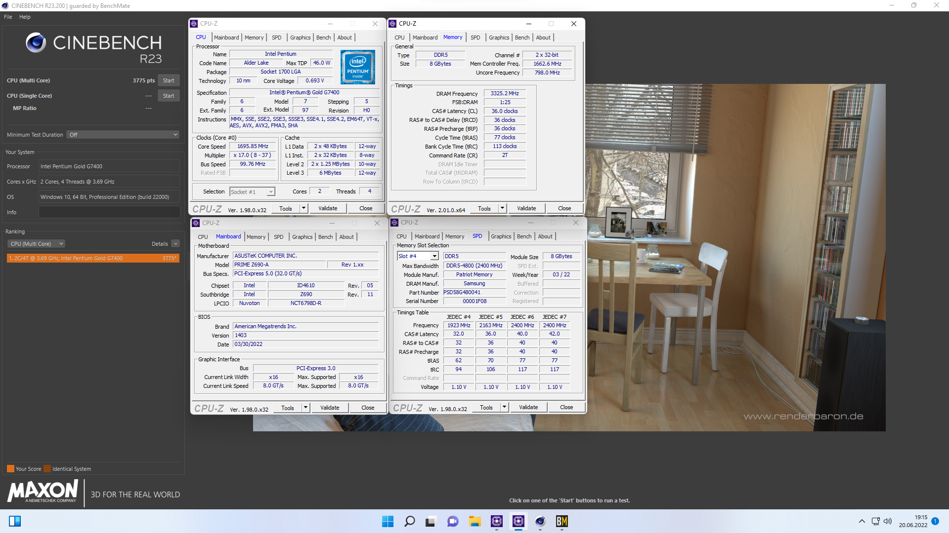 Po instalaci Windows jsem se vrhnul na testy, ačkoliv jsem si byl jist, že napájecí kaskáda s Pentiem G7400 nebude mít problém. Zapnul jsem Cinebench R23 a na něm test stability, který probíhal 30 minut.