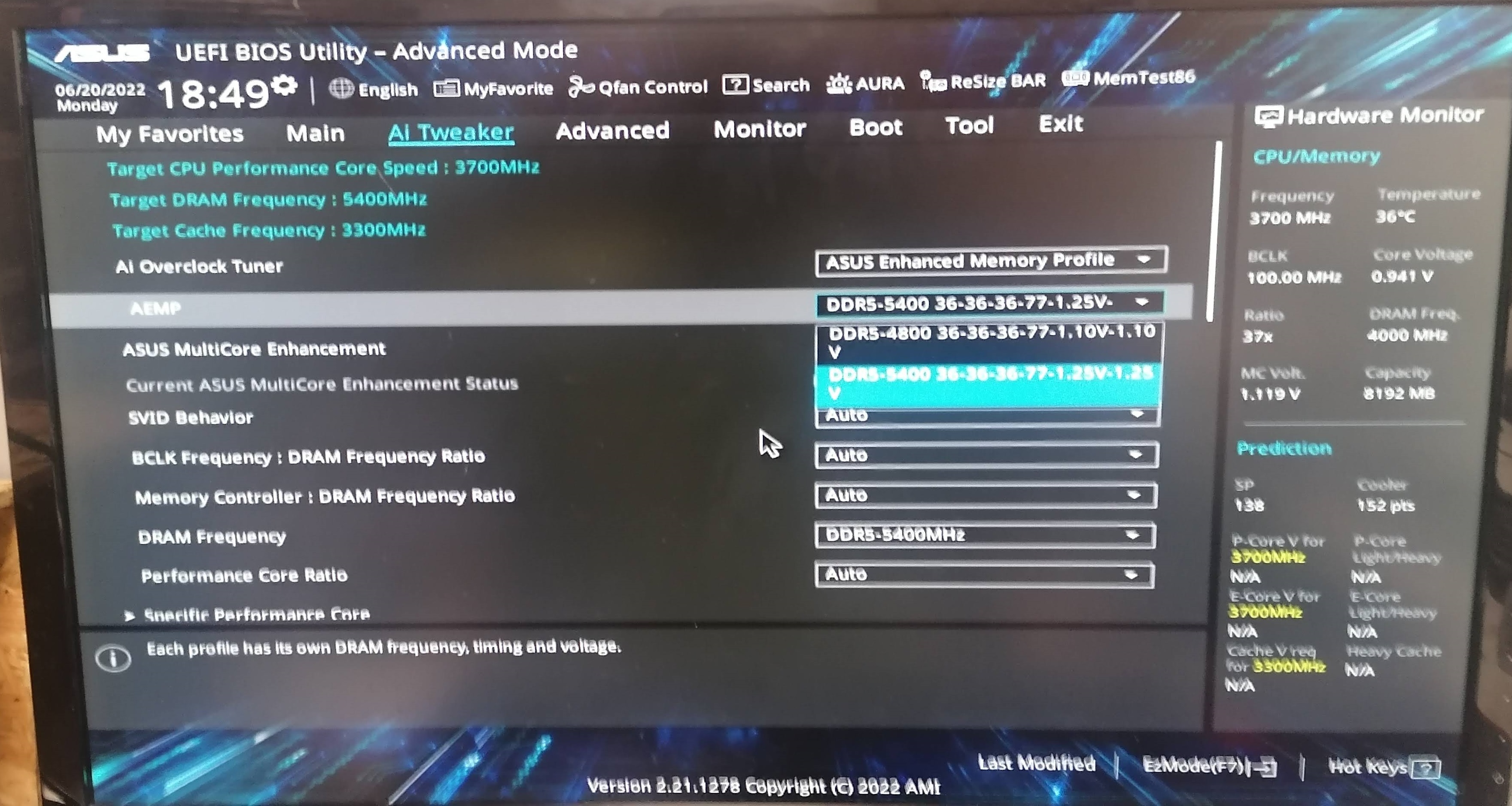 Asus Enchanced Memory Profile (AEMP) je další z novinek na Asus DDR5 deskách. AEMP je přednastavený profil operačních pamětí, který umožňuje posunout výkon operačních pamětí které nemají XMP Profil. Posun výkonu při přepnutí profilu je značný. Na manuální přetaktování nemá, ale i tak se jedná o exkluzivní počin od Asusu. Mé operační paměti byly v základu na 4800MHz a CL40-40-40. Po zapnutí se zvýšily frekvence na 5600MHz a snížilo časování na CL36-36-36. Vyzkoušel jsem stabilitu MemTestem a test proběhl bez chyb.