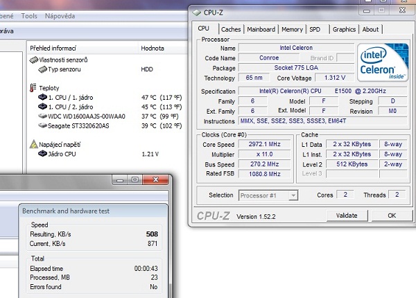 Chtěl bych vám jen předvést co umí nejlevnější dvoujádrový procesor Intel Celeron DualCore E1500 .Tenhle procesor jsem pořídil dokonce pod částku 1000,-kč.Sestavoval jsem další počítač,tak jsem ho zrovna otestoval.Výsledky jsou perfektní.Procesor se nechal snadno přetaktovat o 35 % až na takt 2,97Ghz.Zvýšil jsem FSB na 270Mhz a paměti snížil na 667Mhz.Výsledné takty byly 1080Mhz sběrnice CPU a 900Mhz rychlost pamětí.Tohle dvoujádro vychází z klasických Core2Duo,jen má sníženou l2cache na 512kb.Teploty po hodinovém zatížení ve WinRaru byly kolem 45°C.Obě jádra jely na 100% výkonu.