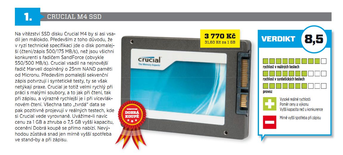 Jak jsem psal, je to jen o ceně. Kdybych tam měl zahrnout záruku, což je u Vertexu 4 a Intel 520 5 let, tak jasně vedou. M4 se prostě někde zastavil a jede setrvačností (ty testy jsou staršího data). Na faktu, že ani Crucial není špatná volba to nic nemění, zvlášť pokud obstojí i v konkurenci nových řadičů SSD. Osobně bych ale zhodnotil víc věcí, než jen výsledky z testu.