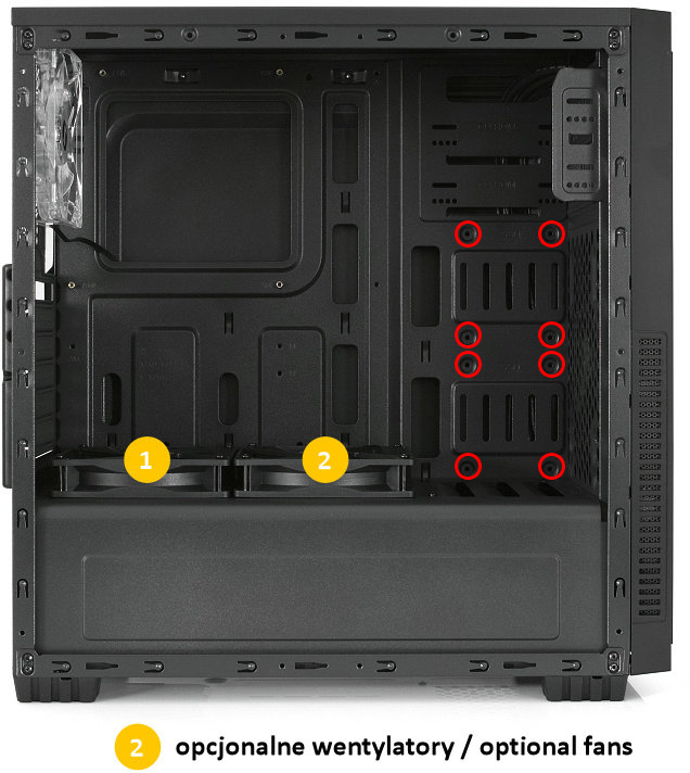 Vpredu mej aspon jeden, nejlepe 2 ventilatory a vzadu jeden, na spodku neni potreba. Tady jsem ti vyznacil sroubky na ssd, z teto strany davas srouby [img][/img] a SSD je z druhe strany. Ve videu v case 3:39 jde videt, jak ma byt https://www.youtube.com/watch?v=U5qZ6S4u3NI .