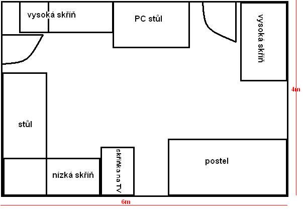 Ještě mě napadá jedna možnost, u které si ale netroufám říct, zda-li bude efektivní. Psal si, že tvůj stúl je 1,5m široký, což by stačilo na středový pod monitorem + 2 přední na okrajích stolu. Sub by sis dal třeba pod nohy, nebo vedle stolu, když tam je těch 20cm. Záleží na tom, jaký model si zakoupíš a na jeho rozměrech. A teď hlavní problém, kam se zadníma. Mohl by si zkusit dát jeden na stůl (ten vlevo - dle tvého plánku) a druhý pověsit buď na zeď nebo na stojan mezi vysokou skříň a postel (vpravo). Tak aby byly ve stejné vzdálenosti od židle u Pc stolu. Ale musel by si jim dvoum zvýšit hlasitost, aby si o nich vůbec věděl..