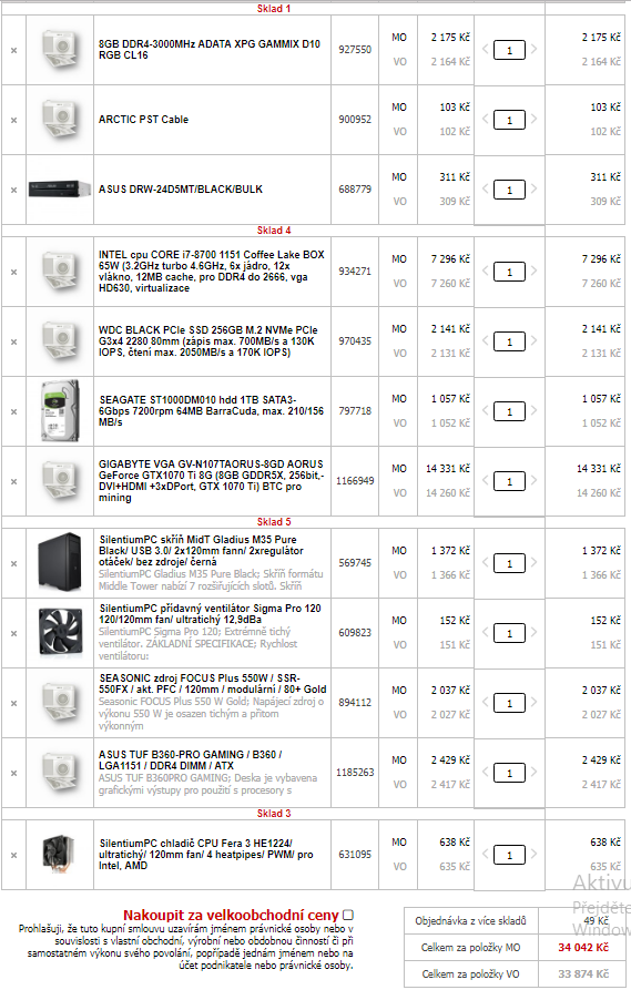 i7-8700 bude dobrá volba při netaktování, chladič na ten M.2 disk určitě ber a grafika nejlevnější skladem viz níže (neřešil bych a bral bych za tu cenu)...