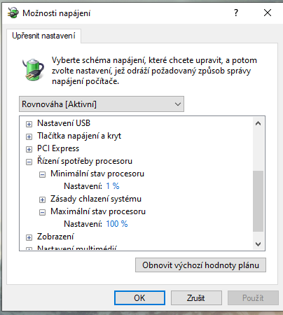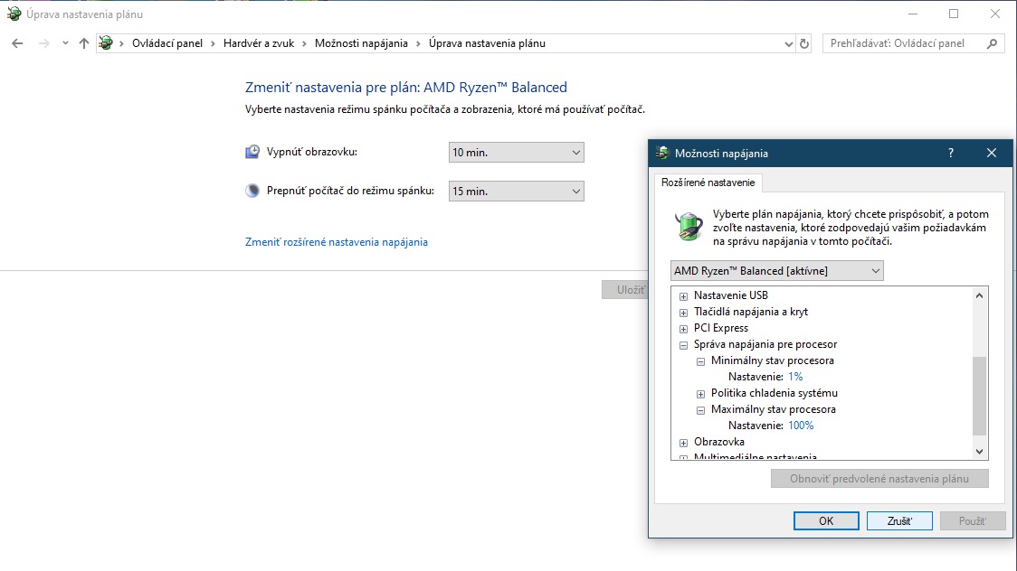 AMD balanced som mal nastavene v správe napajnania procesoru na minimálny stav procesoru 100%