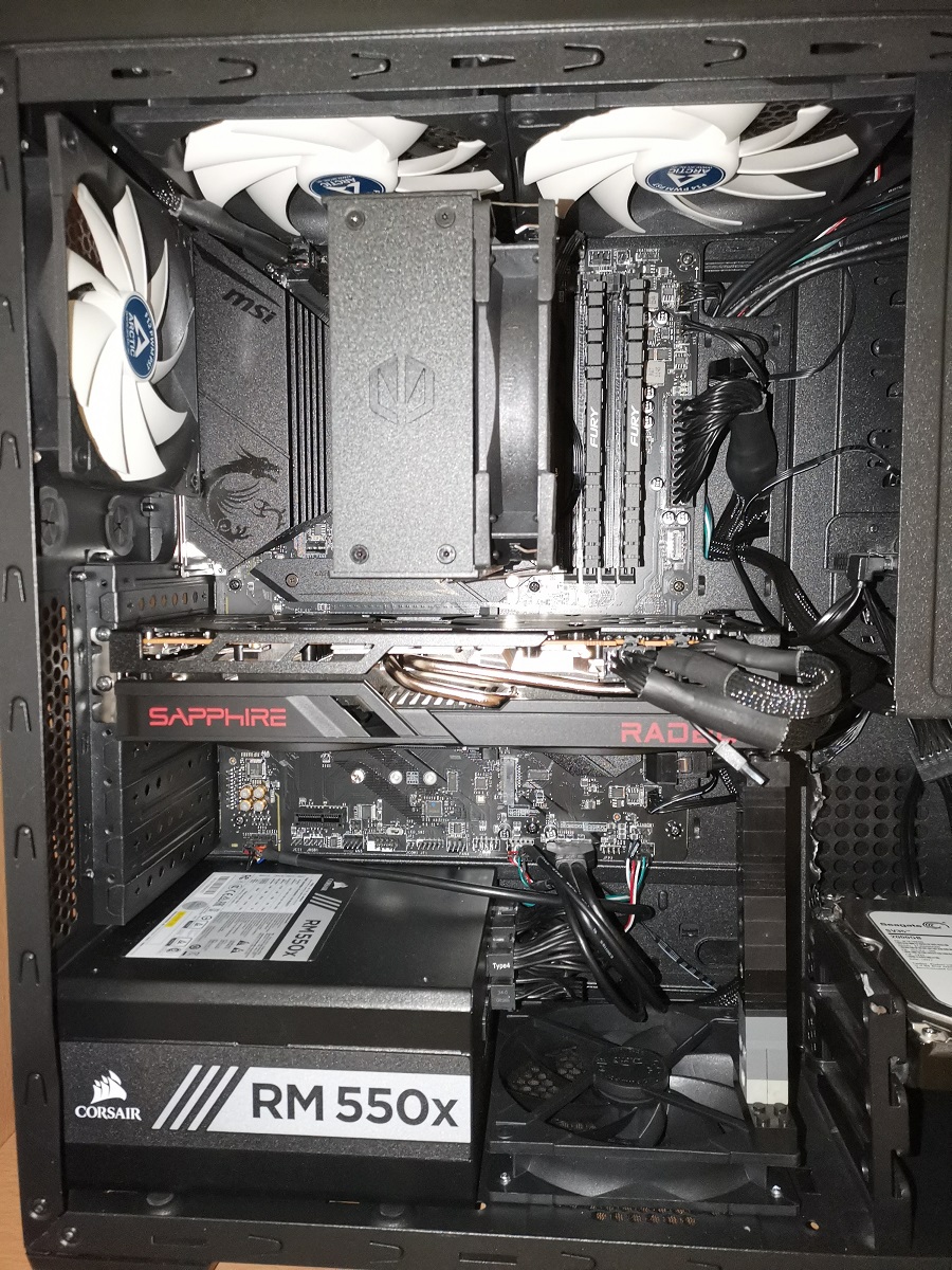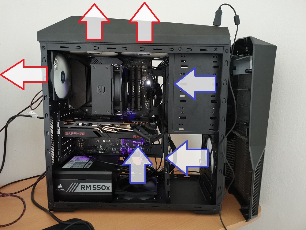 Při stavbě mi byl ten 120 mm ventilátor nakonec k ničemu, protože jsem nepoužil ten starý chladič. Použil jsem ho teda jako ventilátor do bedny a umístil jsem ho naspod. Teď mě ale napadá, jestli to byl dobrý nápad. Nemůže se dít to, že ten spodní ventilátor se ,,bije" s tím předním ventilátorem, a tak se nedostává potřebný vzduch ke grafické kartě? Nebyl by nakonec lepší airflow bez toho spodního ventilátoru? Všechny ventilátory, které nasávají vzduch do bedny, tak jedou na stejné otáčky, protože jsou propojené do sebe, takže pokud se mezi sebou ten přední spodní a dolní ventilátor ,,bije", tak teda efektivně. Proto mě napadá, že se asi nedostane potřebný přísun vzduchu ke grafické kartě. Jak to vnímáte vy?