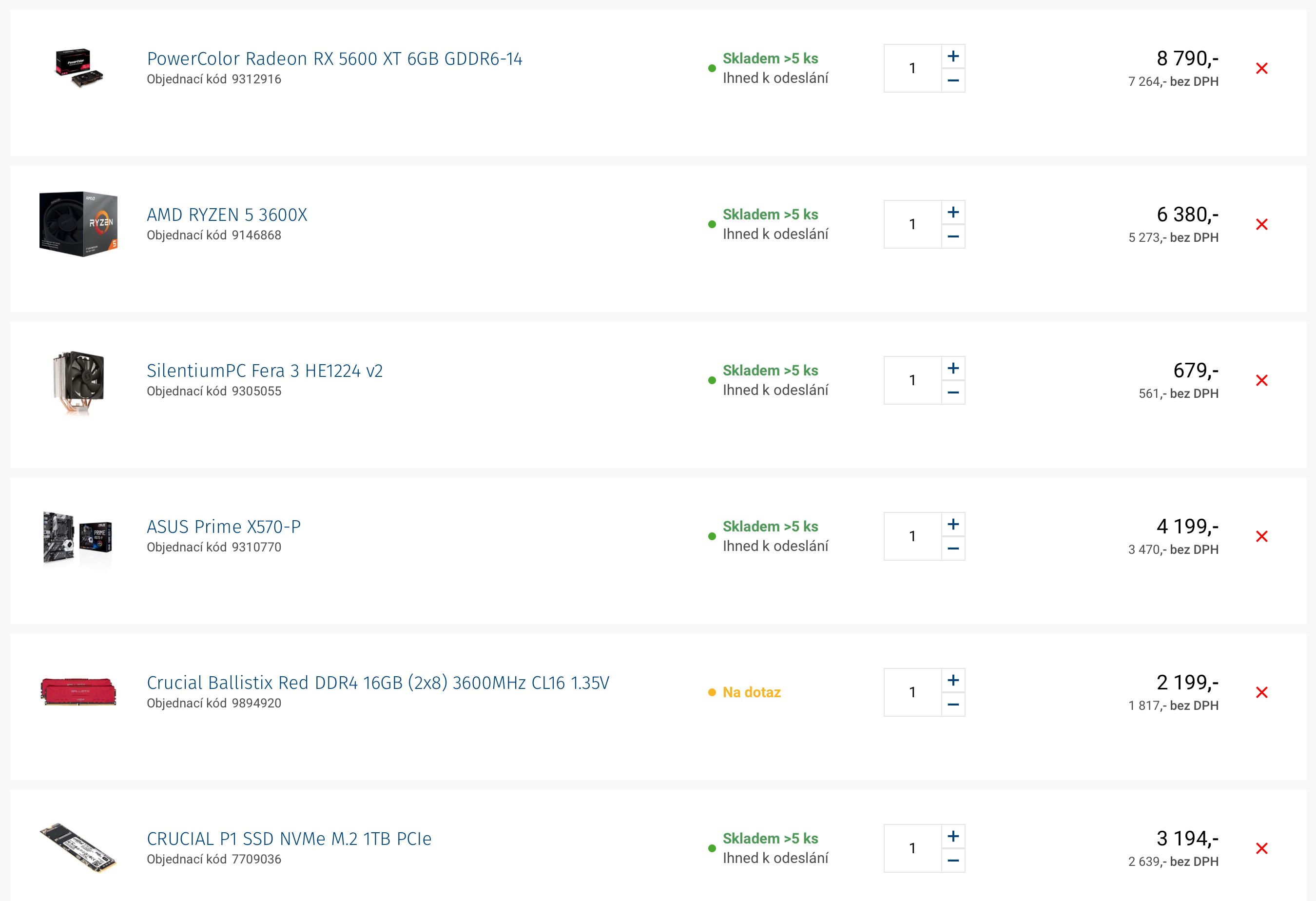 Jakej je smysl té X570, když tam nemáš nějaké velké disky a chceš to na hraní. Navíc ještě se starší generací? Stačí B550 nebo klidně i B450ka. NVMe od Samsungu by bylo lepší, ale šly teď po konci černého pátku nahoru, kup obyč 3600 a přetaktuj si ji sám, RAMky nejsou skladem, klidně kup CL17, rozdíl nepoznáš :)