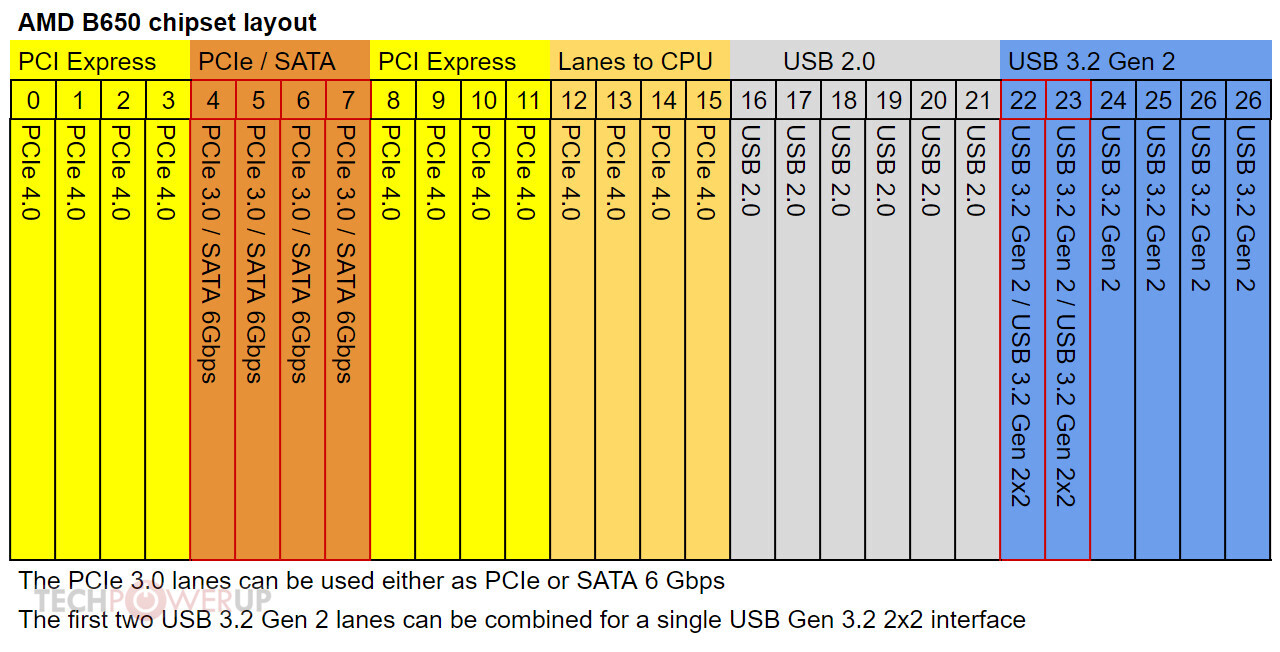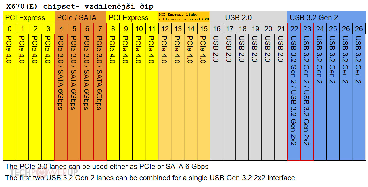 Čip “Promontory 21” má 16 PCI-E linek (12x PCI-E 4.0 + 4x PCI-E 3.0) + 6x USB 2.0 + 6x USB 3.2 Gen 2. Z toho 4 PCI-E 4.0 linky musejí být napojeny buď na socket nebo nebo na druhý čipset v případě X670(E) desek. V případě X670(E) chipsetu, je u čipu přímo napojeného na socket musíme odečíst celkově 8x PCI-E 4.0 linku pro připojení vzdálenějšího chipsetu a socketu CPU.