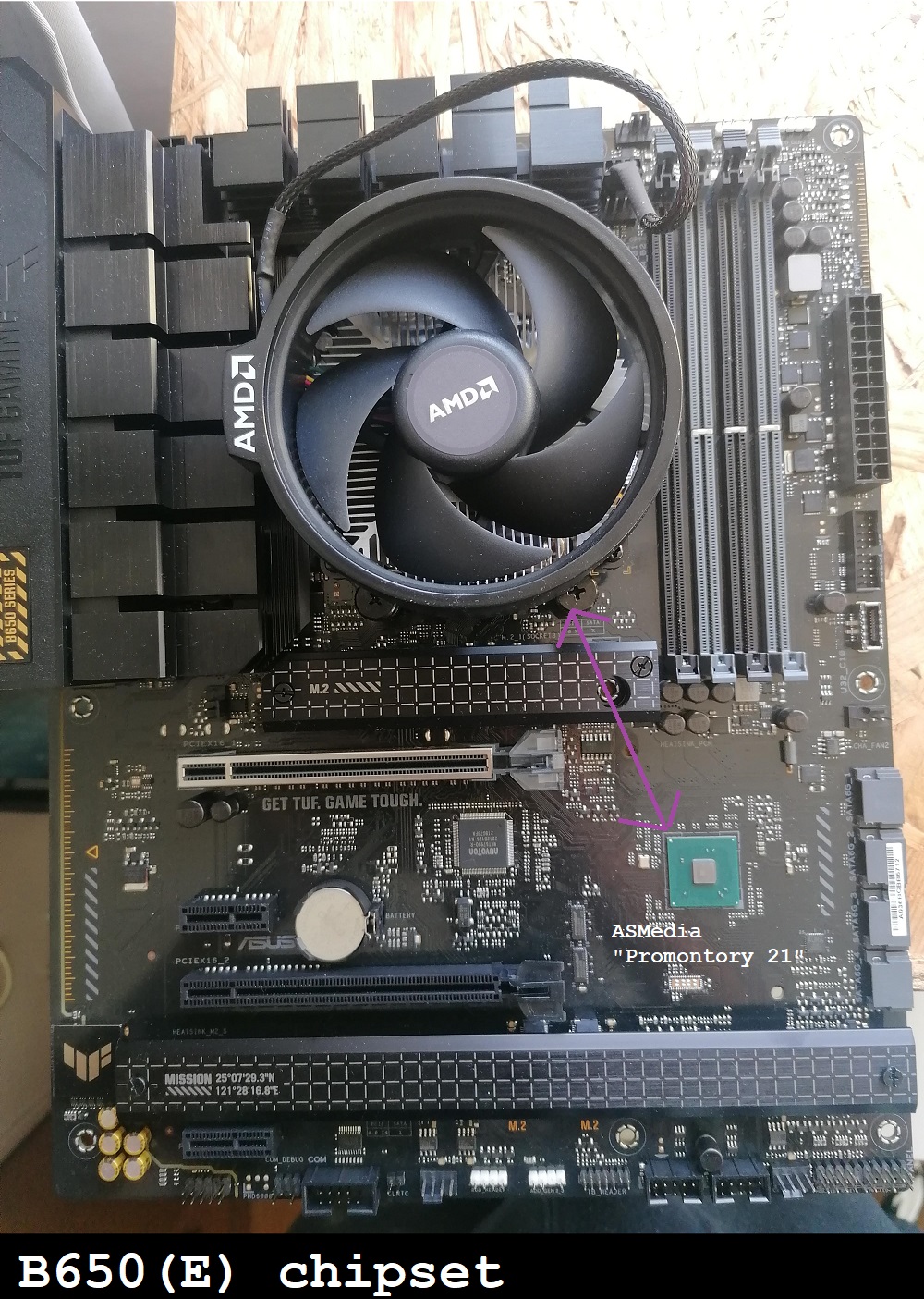 Chipsety B650, B650E ,X670 i X670E vycházejí z jednoho čipu. Tento čip vyrábí ASMedia, která vyráběla i chipsety pro AM4 (vyjma X570, který si navrhovalo a vyrábělo AMD samo). Tento čip ASMedia nazývá "Promontory 21”. Jedná se v podstatě o čip B650(E). Pokud si koupíme základní desku s čipsetem X670(E) najdeme tam tento čip dvakrát paralelně zapojený.