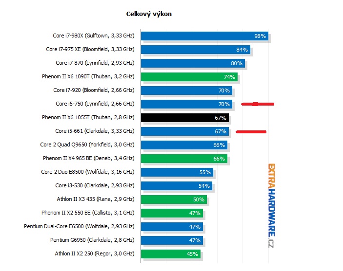 2) zde máš červeně označeno vysoce taktované dvoujádro a i5 750. Co je lepší? K čemu ti bude, že má procesor grafické jádro? Čtyřjádro je prostě lepší a některé hry jej potřebují a v budoucnosti tomu nebude jinak. POZOR V TESTU JE UVEDEN VÝŠE TAKTOVANÝ DVOUJÁDROVÝ PROCESOR než o kterém se bavíme.