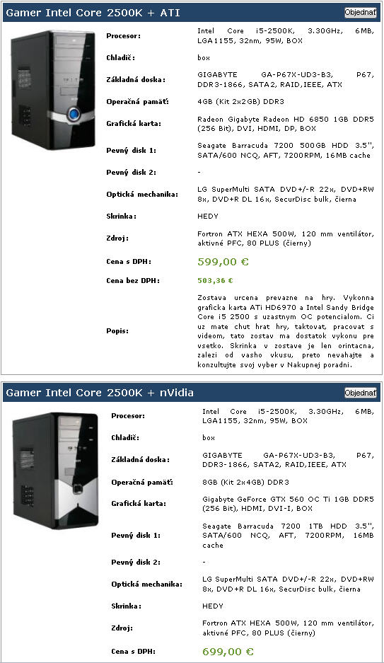 Skříň je nevhodná ke (K) procesru, navíc bez chladiče CPU - tudíž ho taktovat stejně nemůžeš, topil by moc. 6850 v kombinaci s i5-2500 taky žádný odvaz nebude. Ta spodní sestava je slušná, ale obě jsou bez OS, s tím asi počítáš...