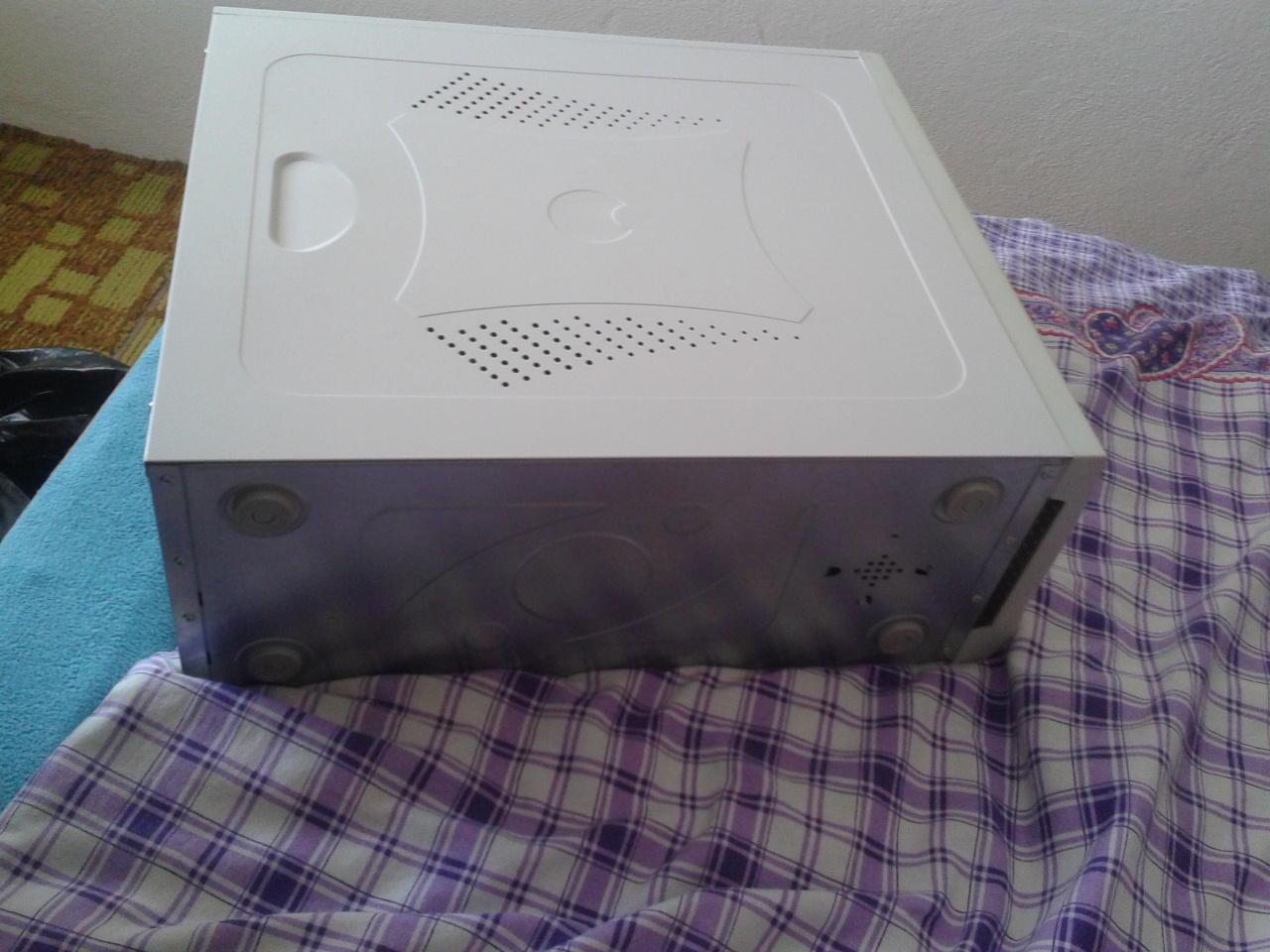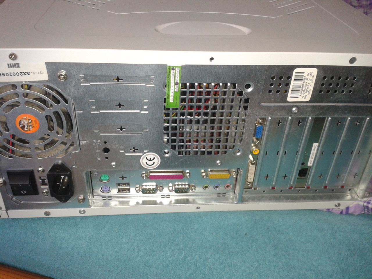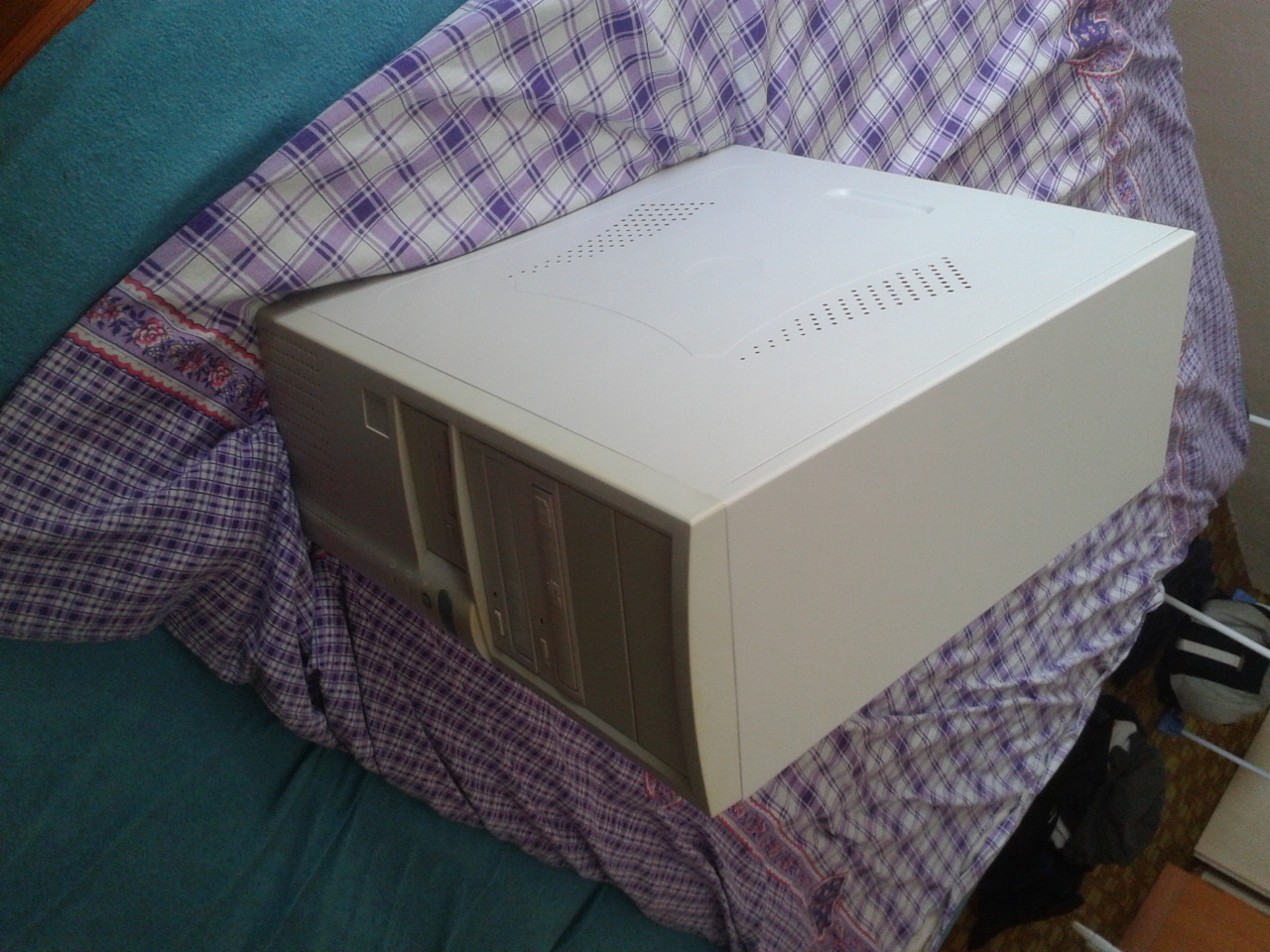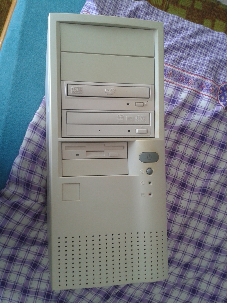 Je tam 1x Folppy mechanika, 2x DVD mechanika, nějaká základní deska, zdroj, je tam i detikovaná grafika, síťová karta a podle toho co jde vidě prach, nejspíš tam bude i nějaký procesor, ram... a vše je úhledně zabaleno v case v barvě slonová kost (v té době vlmi oblíbená barva).