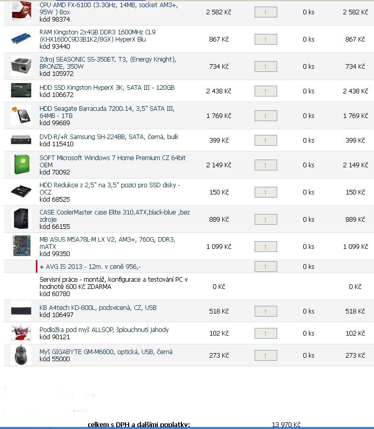 Pokud bys oželel výkon výborného Core i5 a vzal šestijádrový AMD+SSD disk a lepší case,tak by to vypadalo asi takhle http://www.alfacomp.cz/php/basket.php?i ... XK01155I01