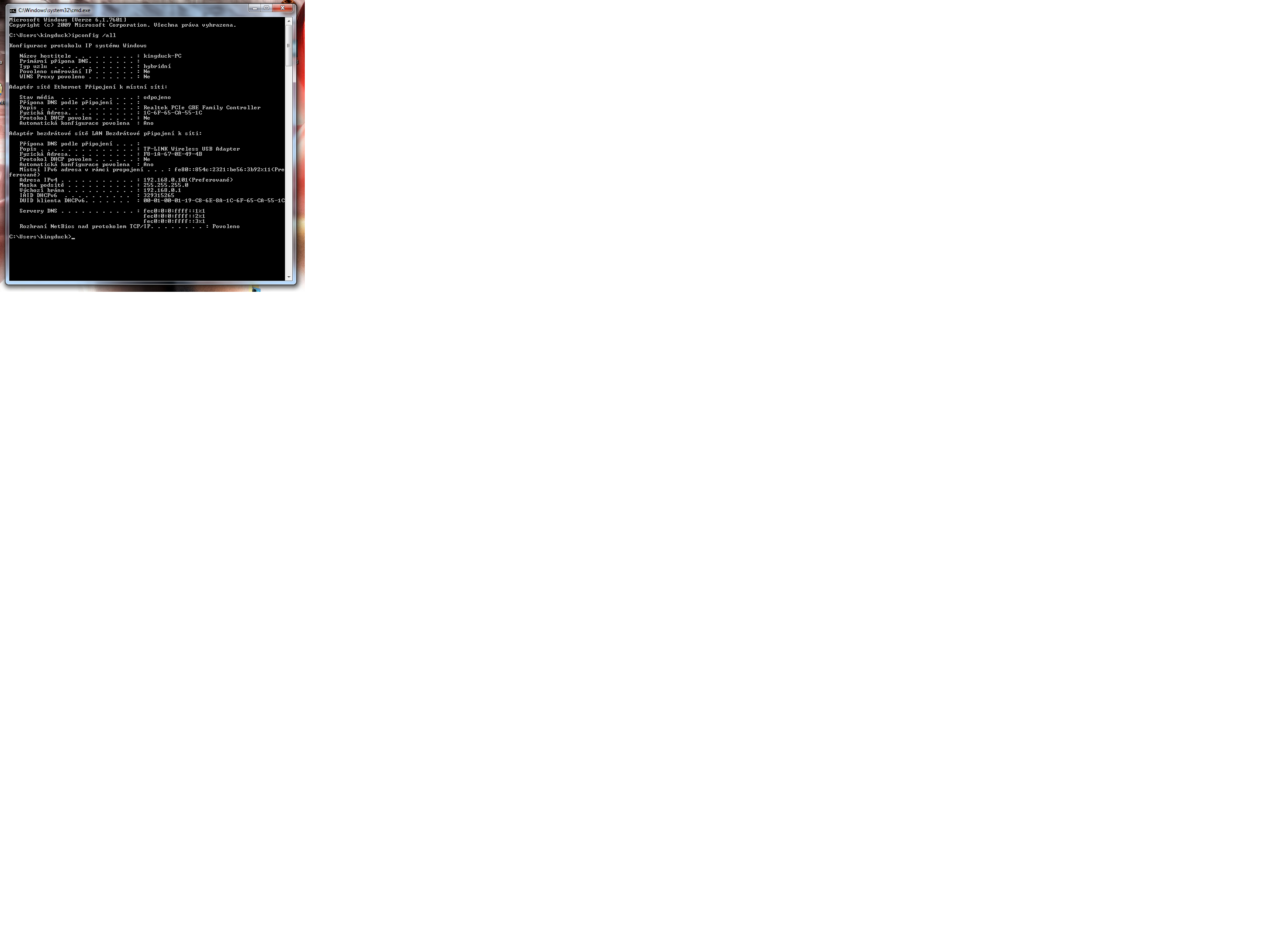 1. Ještě s automatickým nastavením zadám příkaz ipconfig /all. Vezmu papír a tužku a opíšu si tyto hodnoty: