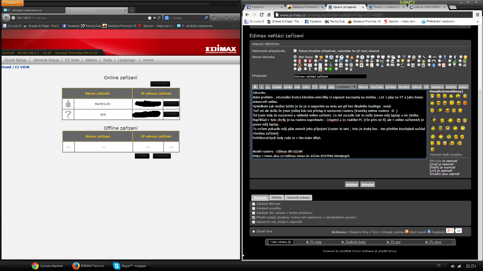 Šel jsem tedy do nastavení a vyhledal online zařízení. Co mě zarazilo tak to našlo jenom můj laptop a nic jiného. Například v tuto chvíly je na routeru napíchnuto : 3xlaptot a 2x stabilní PC (vše přes wi-fi) ale v online zařízeních je pouze můj laptop.
