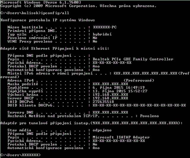 Tady je ten ipconfig. Zaškrtal jsem tam adresy pokud to nevadí...