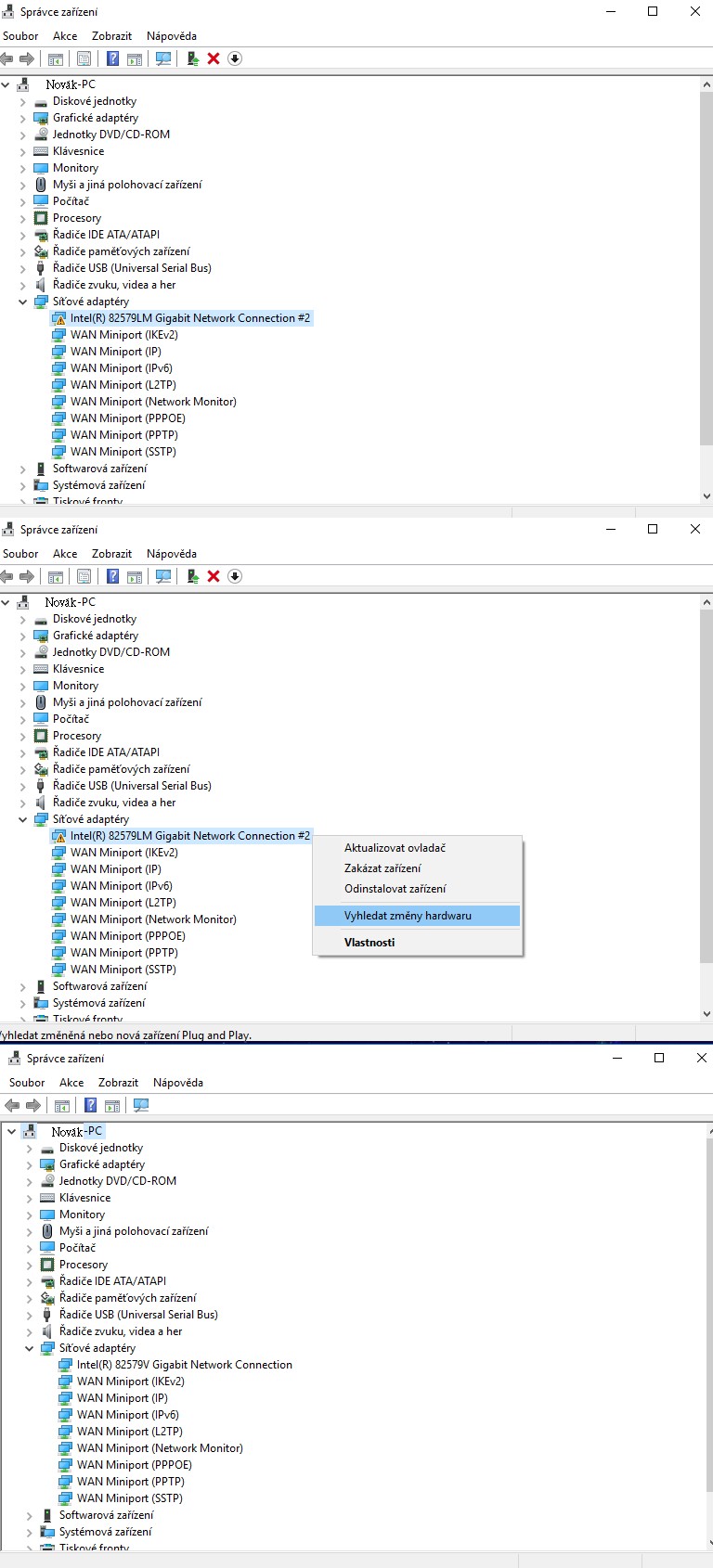Při každém zapnutí mám stejný problém, že PC není připojeno k internetu. Jsem laik, a tak jsem úplnou náhodou přišla na způsob, jak internet zprovoznit, aniž bych musela znova a dokola přeinslalovávat software a pak restartovat PC. Potřebuji poradit, abych vyřešila tento problém jednou pro vždy a né jít po každém spuštění na Správce zařízení a dělat postup viz obr. Děkuji za rady.
