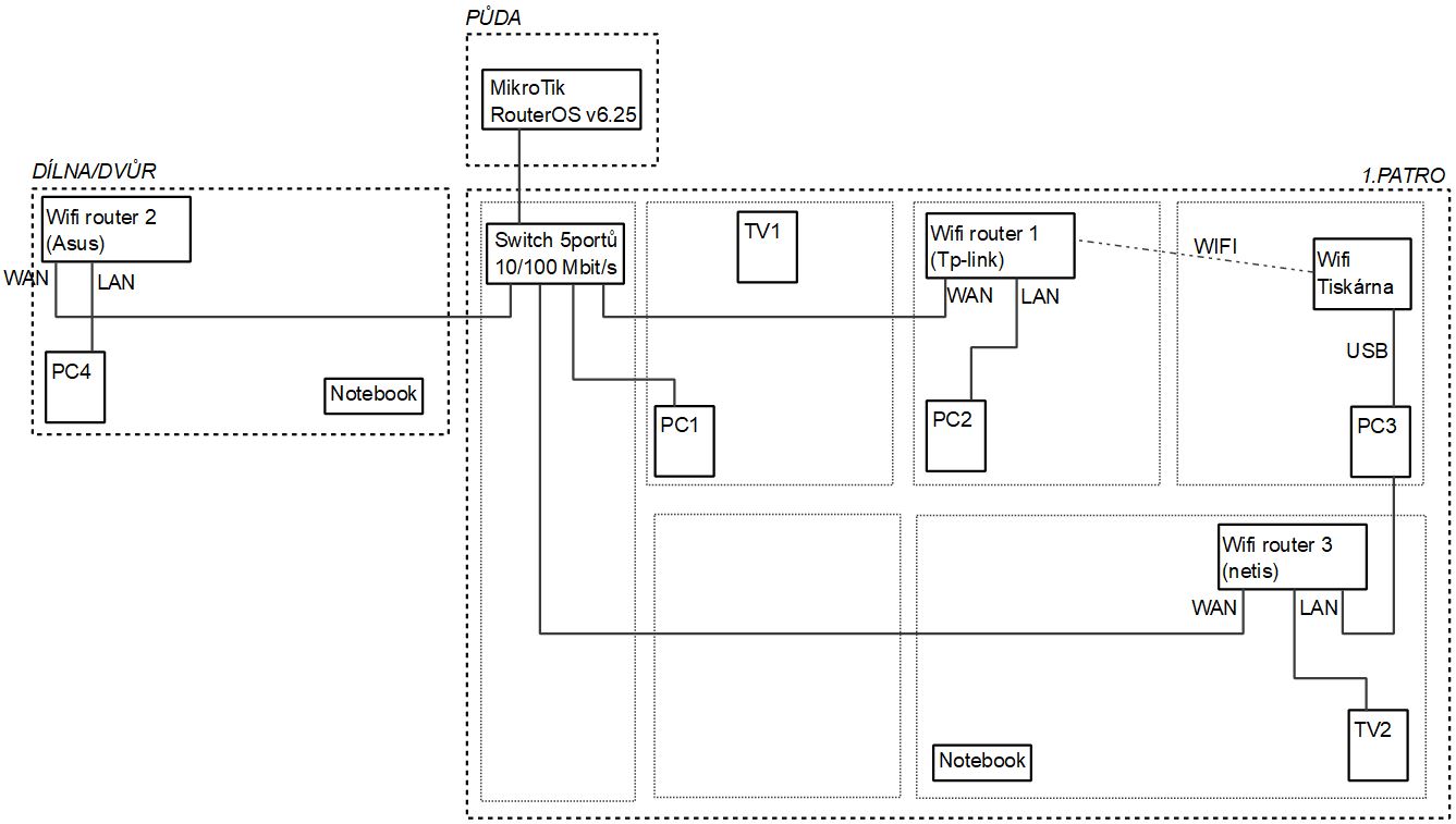 chci se zeptat jestli u takto sestavené sítě jde všechny pc a notebooky zařadit do jedné domácí skupiny(na každém zařízení jsou WINDOWS 10).Problém je, že mi routry vždy změní IP adresu. Potom bych se chtěl zeptat jestli jde udělat, aby šlo z PC1 a PC4 tisknout pomocí wifi a jak