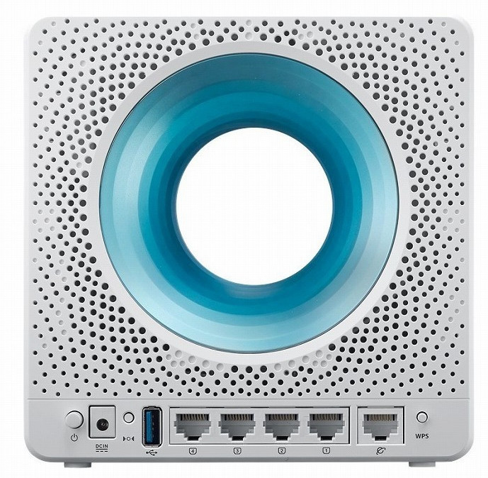 Všimněte si vtipného rozmístění větracích otvorů s různou velikostí :-) Dále zde najdete vše potřebné k připojení a ovládání - Vypínač, napájecí konektor, resetovací tlačítko, USB 3.0 port, 4 porty LAN, WAN port a tlačítko WPS.