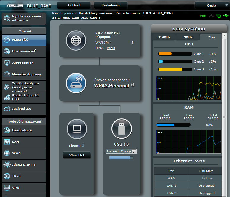 Mapa sítě zobrazuje přehledně stav internetu, připojené porty LAN, připojená USB zařízení a také stav systému v reálném čase. Monitoruje zatížení procesorů i obsazení paměti.