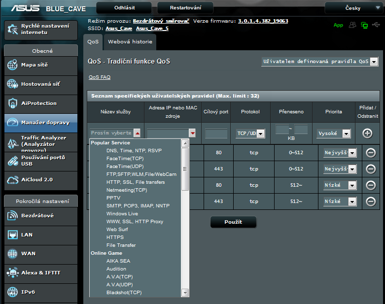 Manažer dopravy - zde se skrývá funkce QoS. Tu můžete provozovat buď v tradičním režimu, nebo jako omezovač šířky pásma. Požaduje zadání parametrů vašeho připojení. Pak si můžete uživatelsky nastavit prioritní připojení pro vaše důležité pakety. A to jak pro internetové služby, tak pro online hry. Seznam her je opravdu obsáhlý.