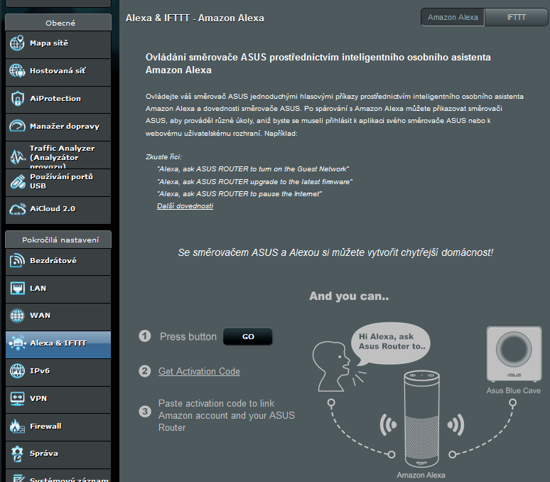 IFTTT je platforma, která propojuje aplikace, služby a zařízení pomocí oznámení “if this, then that”- „jestli se stane tohle, pak udělej tamto“. Těmto jednoduchým podmíněným oznámením se říká “Applety” a tyto Applety provedou jakýkoliv Vámi zadaný úkol prostřednictvím konkrétní podmínky. Jak na to najdete zde: https://www.asus.com/cz/support/FAQ/1033394/