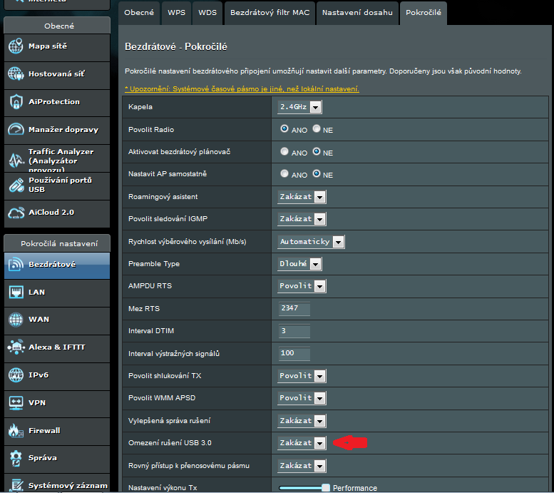 Další novinkou je možnost eliminace rušení WiFi portem USB 3.0. Zařízení USB 3.0 používají frekvenci 2,5 GHz, což je blízko frekvenci 2,4 GHz, na které funguje WiFi. Asus myslel i na tohle, proto nabízí v nastavení možnost omezení tohoto rušení.