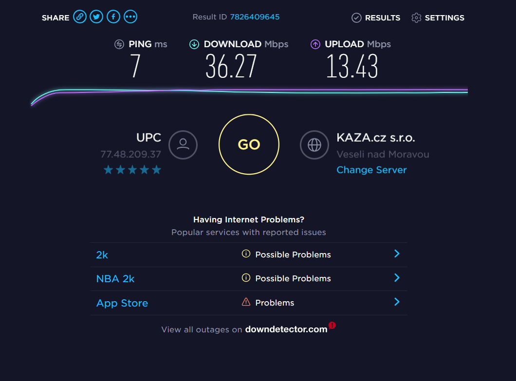 Rychlost downloadu by měla být okolo 40-50Mbps a uploadu okolo 20Mbps